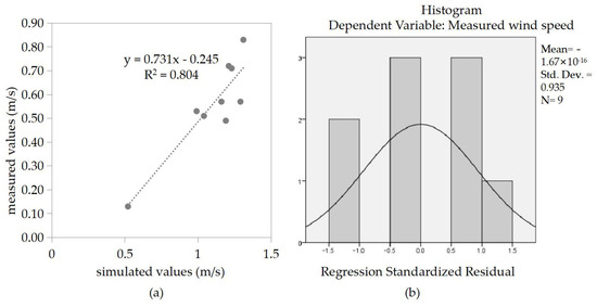(a) Linear regression plot of measured and CFD-simulated values. (b) Histogram of the regression standardized residual.