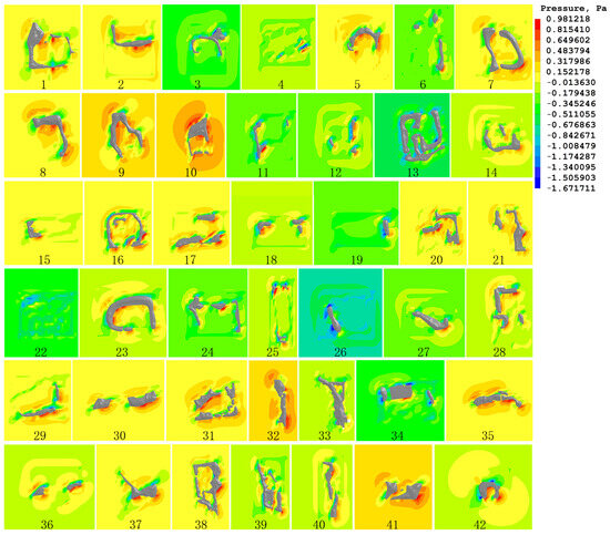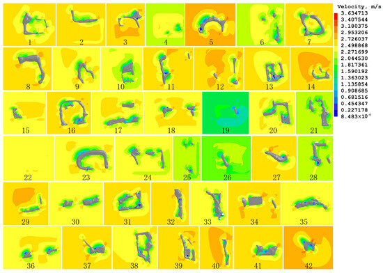 PHOENICS was utilized to assess the influence of the enclosure layout of earthen hills in terms of spatial directions, densities, and area indices on the wind environment for 42 earthen hill spatial models of the Old Summer Palace Ruins Park. The wind speed and wind pressure at a height of 1.5 m (Z = 1.5 m) from the ground for pedestrians were obtained from the CFD simulations (Table 5 and Table 6 and Figure 7 and Figure 8).