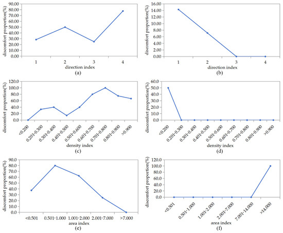 In terms of wind speed, statistical analysis was conducted on the number of spaces containing uncomfortable wind speed detection points among 42 independent earthen hill spaces based on the area classification of the enclosure layout (Figure 9e). As the area index increases, the number of soil mountain spaces with uncomfortable wind speed detection points in the 42 independent earthen hill spaces in summer fluctuates with a peak pattern. The area index ranges from 0.501 to 1.000, with the worst wind comfort. When the area index is greater than 7.000, the wind comfort improves. The area indices of the enclosure layout in the earthen hill space increase, leading to an increase in the sense of the outdoor activity scale within the earthen hill space, resulting in a peak change in its wind comfort; however, in the long run, the discomfort is seen to decrease.