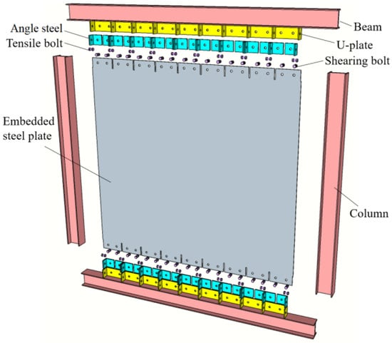 Figure 1 shows the splitting diagram of each part of the U-shaped connection (U-C), including frame beams, frame columns, U-shaped plates, infilled steel plate, connecting angle steels, and high-strength bolts. The frame beam was made of ordinary H-shaped steel welded with U-shaped plates at the bottom of the lower flange. There are two different forms of bolts in U-shaped connection, namely connection bolts between angle steel and an infilled wall panel (sheared bolts) and connection bolts between angle steel and a U-shaped plate (tensile bolts). The sheared bolts are high-strength bolts arranged perpendicular to the infilled plate, while tensile bolts are high-strength bolts arranged parallel to the infilled plate. The U-shaped plate in the connection was a perforated steel plate with multiple U-shaped grooves of equal dimensions. Bolt holes were provided on both flanges of the connecting angle steel. H-shaped steel columns were employed for the frame columns.