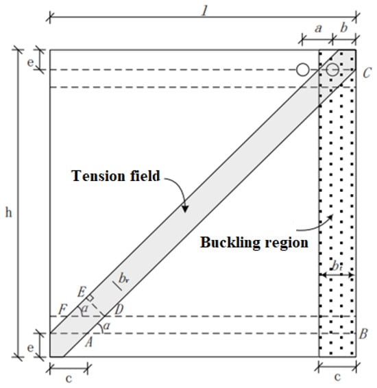 The U-shaped connection proposed in this chapter is meticulously devised to prevent slippage between the wall panel and the connecting angle steel and U-shaped plate. Therefore, it becomes imperative to ensure that the maximum shear force that a single high-strength bolt can sustain in the corner tension field surpasses the ultimate tensile strength of the tension field it supports. The calculation model for the joint design is depicted in Figure 2.