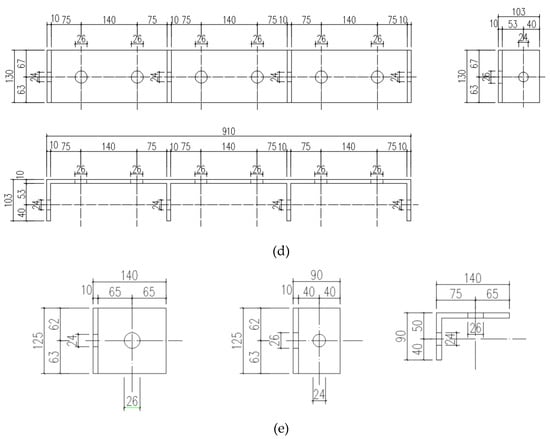 Details of specimen. (a) Front view of the specimen; (b) side view of the specimen; (c) embedded steel plate; (d) U-shaped plate; (e) Angle steel.