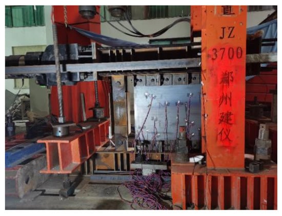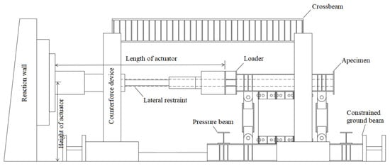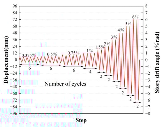 The experiment employed a hydraulic servo system to apply low-cycle reciprocating loads under displacement control throughout the test. Horizontal loads were generated by an MTS 150 t tension-compression actuator connected to one end of the top beam. Lateral constraint beams, affixed to the reaction frame on both sides of the upper beam, were introduced to prevent any out-of-plane displacement during the loading process. Horizontal and vertical restraint beams were positioned at both ends of the bottom beam to constrain its displacement. The loading devices are illustrated in Figure 5 and Figure 6. The loading protocol is the low-cycle reciprocating loading in accordance with the AISC 341–16, and the loading protocol is shown in Figure 7.