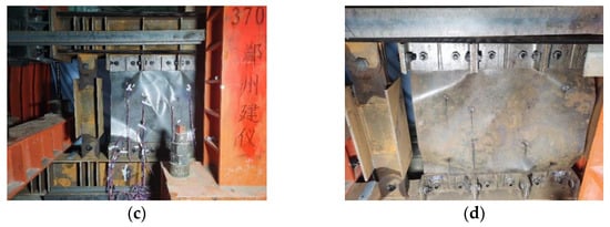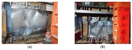 After unloading following the completion of the loading phases, the observed failure modes of the components are depicted in Figure 8. After the experiment, all parts of the specimen were disassembled and it was observed that frame beams, U-shaped connection plates in the connection region, and angle steels did not exhibit significant deformation. The bolt holes in these components also showed no noticeable deformation. Severe damage was limited to the infilled wall panels. This indicates that the BPSW-U effectively protects the main frame and connection regions. Post-earthquake functionality can be easily restored by simply replacing the infilled wall panels.