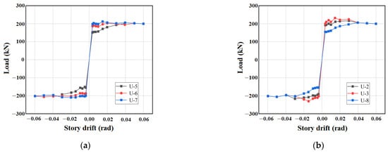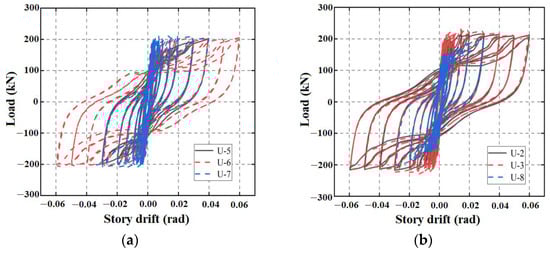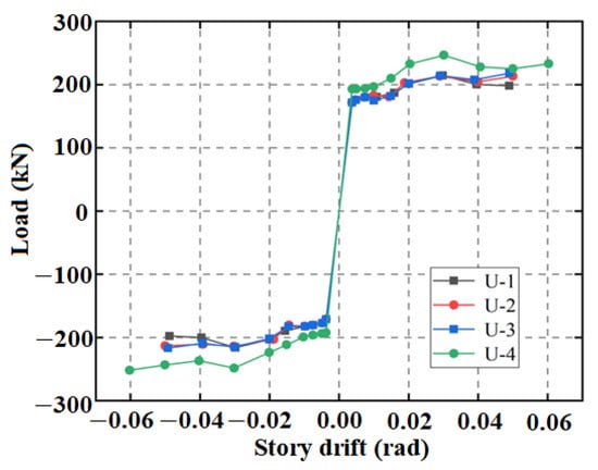 The hysteresis curves of the four specimens are shown in Figure 9. A comprehensive comparative analysis reveals the following trends: the hysteresis curves of specimens U-1 and U-2 exhibit a remarkable degree of similarity, with U-3 presenting a slightly plumper hysteresis response compared to the former two. Remarkably, the hysteresis curve of U-4 appears the plumpest. This is attributed to U-1 and U-2 both utilizing Grade 10.9 high-strength bolts with a diameter of 20 mm as shear-resistant bolts. The frictional forces between the embedded wall panels and cover plates in the nodal region are the same for both specimens, and both specimens use 3 mm thick steel plates as embedded wall panels. The only difference between U-1 and U-2 is the diameter of the tensile bolts, and their hysteresis performance was equivalent. This indicated that the tensile bolts only needed to meet the requirements of Equation (19). Once this requirement is met, increasing the diameter or quantity of the tensile bolts does not have a significant impact on the hysteresis performance of the joint. The variation in tensile bolts has little impact on the hysteresis performance of specimens U-1 and U-2. Increasing the diameter of the shear-resistant bolts and consequently increasing the frictional forces between the embedded wall panels and cover plates in the nodal region is beneficial in delaying the sliding of the embedded wall panels in the nodal region, thereby postponing pinching in the hysteresis curve. This is because frictional forces can also provide a certain amount of energy dissipation capacity for the prefabricated steel plate shear wall. Changing the wall panel thickness significantly enhances the ultimate load-carrying capacity of the specimens and the fullness of the hysteresis curve. However, it has little effect on the bolt sliding time.