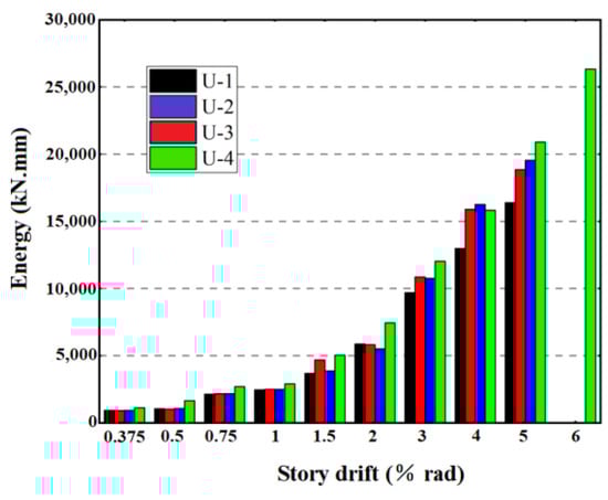 By calculating the enveloping area of the hysteresis curve for each specimen at every loading level, the obtained values represent the energy dissipated by the specimens at that loading level, as shown in Figure 11. Overall, due to the utilization of thicker infilled steel plates, specimen U-4 demonstrates progressively superior energy dissipation capabilities with increasing inter-story drift compared to the other three specimens. In the initial four loading levels, specimens U-1, U-2, and U-3 exhibit similar energy dissipation capacities. In the fifth loading level, the larger diameter of the shear-resistant bolts in U-3 results in greater frictional forces between the infilled wall panel and connecting plates, consequently providing more significant energy dissipation due to bolt sliding than the other three specimens. However, as the coefficient of friction on the contact surface noticeably decreases with an increasing number of sliding cycles, the subsequent loading levels do not manifest the advantage of sliding-induced energy dissipation.
