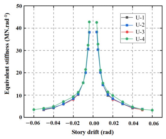 The equivalent stiffness of each specimen is extracted to generate equivalent stiffness degradation curves, as shown in Figure 12. The positive and negative stiffness degradation curves for all four specimens exhibit a pronounced symmetry. Specimen U-4, characterized by a higher initial stiffness, experiences the fastest rate of stiffness degradation, reaching only 8% of its initial stiffness at the end of the test. The stiffness degradation curves for specimens U-1, U-2, and U-3 closely coincide, suggesting that altering the diameter of the connecting bolts has no discernible impact on the initial stiffness and stiffness degradation of the specimens.