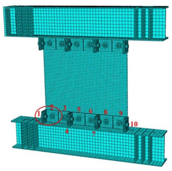 The Finite Element Model (FEM) of the U-shaped connection is established using ABAQUS, as illustrated in Figure 13. The red numbers in the figure are bolt numbers. Bolts 1,4,7, and 10 are tensile bolts. Bolts 2,3,5,6,8, and 9 are shear bolts. The FEM’s detailed dimensions mirror those of the physical specimens. Given that the experimental components featured hinged columns, the frame columns were simplified accordingly in the FEM []. With the exception of the rigid pad at the loading point, all other components are modeled based on the solid model, utilizing C3D8R as the model element. The friction coefficient between bolts and various components is taken as 0.05, and the friction coefficient of the contact surfaces between other components is taken as 0.25. Recognizing the elevated stress at the connection between the infilled steel plate and the frame beam, the mesh density is appropriately increased at the corresponding position in the model. In the case of U-2 and U-4, only the thickness of the infilled steel plate was modified in the modeling process. Specimens U-1 and U-3 exhibit distinct diameters for the tensile and shear bolts, while the dimensions of the other components remain consistent. The loading protocol for the finite element simulation is consistent with the quasi-static test.