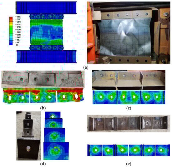 Comparison between test and finite element failure mode of specimen U-2. (a) The entire wall panel; (b) infilled steel plate; (c) U-shaped plate; (d) the side of the angle steel; (e) the front of the angle steel.
