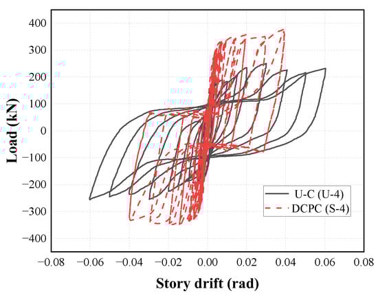 A comparison between the experimental results of the U-C (U-4) and the DCPC (S-4) [] is presented in Figure 18. Analysis indicates that, with the use of identical-sized infilled steel plates, the DCPC exhibits higher ultimate bearing capacity. However, its hysteresis curve shows more pronounced pinching, while the U-C’s hysteresis curve is plumper. The initial stiffness of the two is essentially the same. Regarding the failure mode, in the last few loading levels, the DCPC shows slight irreversible deformation in the frame beam, whereas the U-C effectively protects the frame beam, thereby enhancing the seismic recovery performance of BPSW-U.