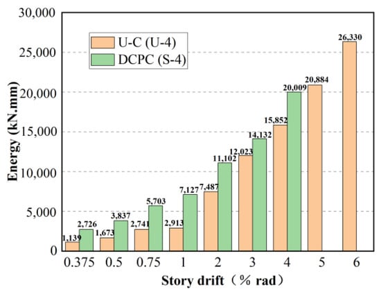 By computing the enveloping area of the hysteretic curves, the energy dissipation for both entities is determined, as shown in Figure 19. Analysis indicates that the energy dissipation capacity of DCPC exceeds that of the U-C; however, with the augmentation of the inter-story displacement angle, the distinction in their energy dissipation performances gradually diminishes. The energy dissipation capacity of DCPC exceeds that of U-C for two main reasons. Firstly, the shear bolt quantity in DCPC joint specimens is 1.5 times that of U-C, resulting in a delayed wall panel sliding. Secondly, in U-C joints, notches are introduced in the embedded steel plate to meet installation requirements, significantly reducing the shear-carrying capacity of the embedded steel plate. Nevertheless, as the inter-story displacement increases, the comprehensive development of the tension band contributes to partially compensating for this attenuation.