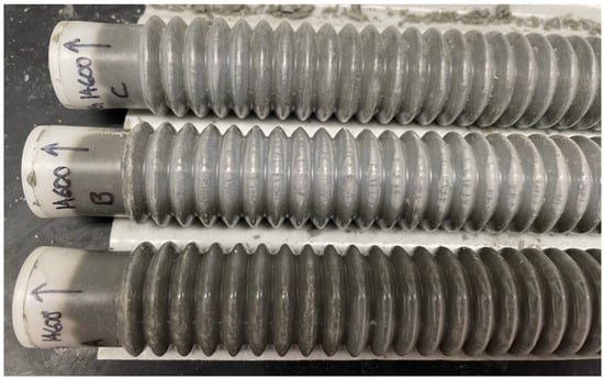 The methodology of ASTM C1698-19 was adopted to measure the effect of copolymers on the autogenous shrinkage of cement paste. The fresh cement paste samples were cast into corrugated polyethylene tubes (length: 42 cm, diameter: 2.9 cm) according to the standard and capped. The change in the length of the tubes was measured in 12 h increments for the first week and every day after that for up to 28 days at an ambient temperature of 22 °C. The length measurement was conducted using a digital displacement gauge (Germann Instruments, Evanston, IL, USA). Figure 1 shows the corrugated tubes used to measure the autogenous shrinkage.