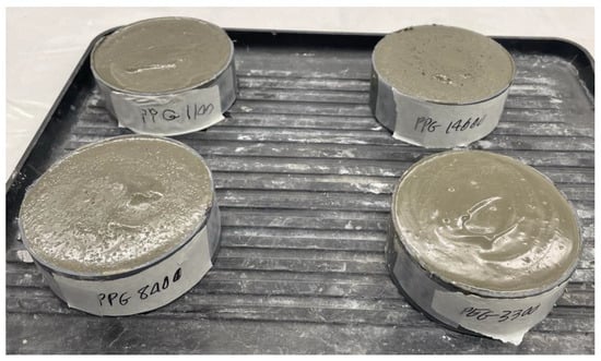 Setting times were determined with the Vicat needle equipment, and measurements were performed at 10 min increments at 5 discrete locations on the paste until a lack of impression on the paste was observed, indicating final setting times, respectively. Figure 2 shows the pastes prior to the setting time experiment.