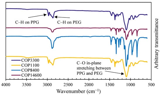 Figure 3 displays the FTIR transmittance spectrum for the copolymers in their native form. Since no water solvent was used, the O–H peaks at 3300 cm−1 and 1640 cm−1 that are associated with water are not present. Major peaks corresponding to C–H backbone groups at 2970 cm−1 for PPG and 2860 cm−1 for PEG are observed []. Another major peak is observed at 1090 cm−1 that belongs to C–O in-plane stretching groups between PEG and PPG [].
