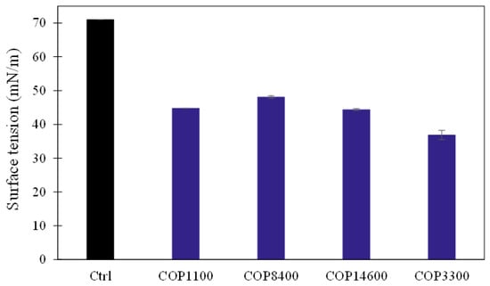Surface tension is an important parameter that governs many of the interfacial interactions in cementitious materials and affects the microstructure []. The behavior of different chemicals such as AEAs and SRA is affected by their surface tension. The molecular properties of the surfactant, including the length and size of the hydrophobic groups, molecular size, and charge can affect the surface tension of the surfactant [,]. In copolymers, a lower PEG/PPG value or a smaller HLB generally indicates higher hydrophobicity and lower surface tension []. COP3300 has the lowest surface tension among all the copolymers, which is due to the very hydrophobic nature of COP3300. The exceptionally low HLB of 1 in COP3300, displayed in Table 1, is an indication of the high hydrophobicity of COP3300. Although the other copolymers have higher hydrophilicity, the presence of hydrophobic PPG groups in their structure keeps their surface tension relatively low.