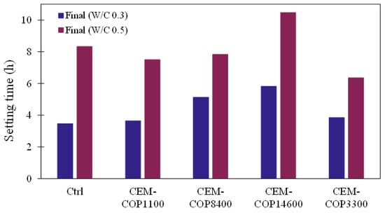 The setting times of the control paste and the pastes with copolymers are shown in Figure 5. It is seen that the setting time of CEM-COP14600 is the highest compared to other pastes at both W/C of 0.3 and 0.5. CEM-COP8400 showed a slightly larger setting time compared to the control paste and CEM-COP1100 and CEM-COP3300 at W/C of 0.3. It has been shown in the literature that the addition of charged polymers could affect setting time in cement pastes due to the adsorption of charged polymers on the heterogeneous phases of hydrating cement particles, which could decrease the dissolution rate and delay the hydration reaction and the setting time [,]. Since the copolymers used in our study are non-ionic and do not adsorb onto cement particles, their effect on cement hydration and solid skeleton formation is small. However, in CEM-COP14600, due to the presence of a large volume of air voids that reduce the volume fraction of the hydrating cement in the paste, the setting time is slightly delayed as shown in Figure 5 for this paste.
