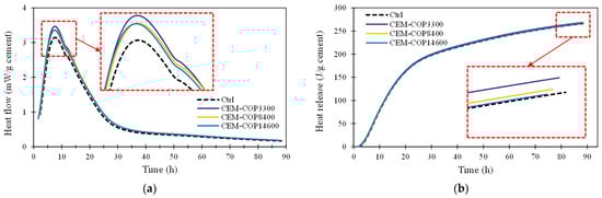 The rate of hydration heat and cumulative heat of the control paste, and the pastes modified with the copolymers are shown in Figure 6. It is seen in Figure 6a that all pastes showed a peak at about the same time. This peak corresponds to the formation of binding phases produced by the hydration reaction []. This peak is typically associated with the final setting time of the pastes. It is evident that the heat rate results are generally in good agreement with the setting time results discussed earlier. Another peak marked in the heat rate curves shown in Figure 6a is also seen in all pastes, which corresponds to the secondary ettringite formation []. A slight increase in the magnitude of the peak in the pastes modified with copolymers compared to the control paste is noticed. The cumulative heat curves of the pastes show a relatively similar behavior. It appears that the cumulative heat of the pastes with the copolymers was slightly higher compared to that of the control paste at late times of hydration. The results show a low impact of copolymers on the hydration mechanisms of cement pastes. One influential parameter can be traced back to the low adsorption of copolymers on the cement surface since many polymers need to adsorb on the surface before interfering with the hydration mechanisms []. The slight increase in the hydration of the pastes with the copolymers could be due to higher homogenous nucleation of cement due to lower interfacial energy stemming from the surface activity of surfactants as suggested by Gueit et al. [].