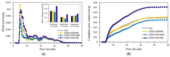 (a) Pore size distribution and (b) cumulative pore volume of the pastes.