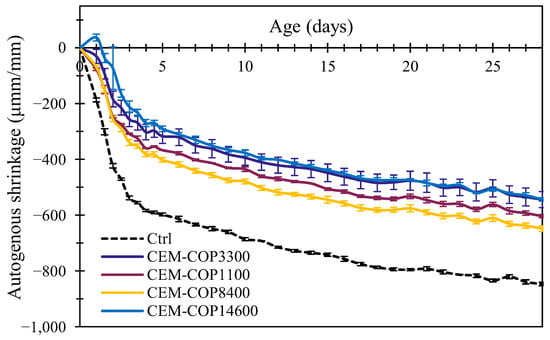 The autogenous shrinkage of the control paste and the pastes modified with copolymers is shown in Figure 8. It is seen that the paste with the copolymers had a lower autogenous shrinkage compared to the control paste. The autogenous shrinkage increased more rapidly in all pastes in the first 3 days and then continued to increase at a smaller rate as seen in the figure. In cement pastes with a low W/C, water is consumed as a hydration reaction occurs leading to self-desiccation. With a reduction in the relative humidity, the stress is developed in the capillary pore solution, which pulls on the solid skeleton of the paste, and this manifests as an overall reduction in the volume of the material []. This reduction in volume occurs without interactions with the external environment and is called autogenous shrinkage. In a constrained condition, autogenous shrinkage leads to the buildup of tensile stress in the solid skeleton, which could result in crack formation when the critical tensile strength is reached. The capillary stress in the pore solution is dependent on the surface tension of the pore solution. Thus, the reduction in the surface tension of the pore solution could reduce autogenous shrinkage in the paste [,]. A comparison of the surface tension results shown in Figure 4 and the autogenous shrinkage results indicates that the reduction in the autogenous shrinkage of the paste with the copolymers is primarily due to the effect of copolymers in reducing the surface tension of the pore solution in the pastes. It should be noted that the presence of air voids reduces the volume fraction of the capillary pores that are responsible for autogenous shrinkage; thus, it is expected that the lower volume fraction of capillary pores in CEM-COP14600 with a large air-void porosity could contribute to a lower autogenous shrinkage in this paste, compared to other pastes as seen in Figure 7.