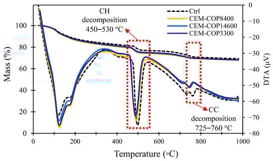 To prepare the samples for the thermogravimetric analysis, core samples were extracted from the center of 1-inch cubes, ground in a mortar and pestle, and passed through the #200 sieve to only retain sizes below 75 μm. The powders were then dried at 40 °C in a vacuum oven for 24 h before testing. The experiment was performed on a DTG-60H (Shimadzu, Tampa, FL, USA) using nitrogen gas as the atmosphere with a flow rate of 50 mL/min. The temperature range was from 25 to 1000 °C with a temperature ramp of 20 °C/min and a hold time of 5 min at the peak. The differential thermal analysis (DTA) curve was calculated based on the mass loss curve. The Ca(OH)2 (CH) content was quantified in the range of 450–530 °C, and the CaCO3 (CC) content was quantified in the range of 725–760 °C [,,,,].