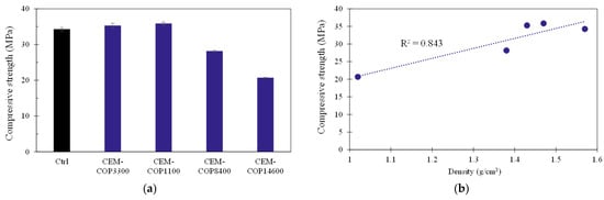 Compressive strength of the control paste and the pastes with copolymers. (a) Compressive strength of samples. (b) Relationship between compressive strength and density.