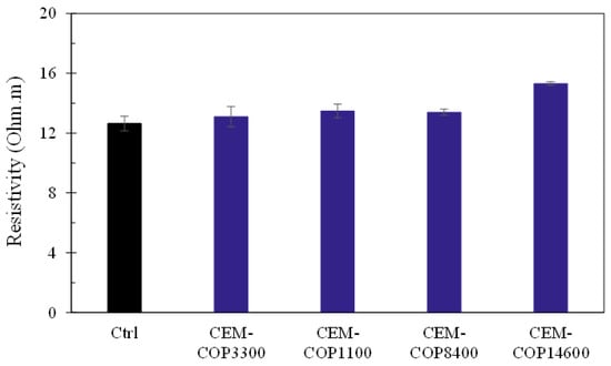 - The electrical resistivity of the pastes with the copolymers was similar to that of the control paste except in the case of CEM-COP14600, where a noticeable increase in electrical resistivity was observed. The presence of a large volume of air voids that act as electrical insulators is responsible for the higher electrical resistivity in this paste.