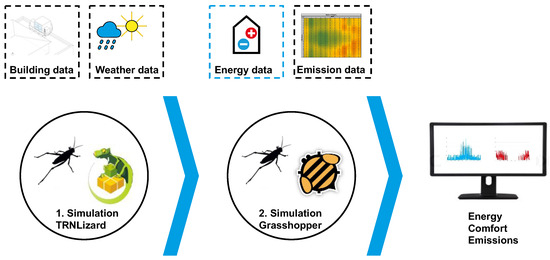 This paper uses three simulation software tools. The fundamental thermodynamic building simulation is performed in TRNLizard, representing the parametric version of TRNSYS 18 in the software environment of Rhino 3D [24,25]. TRNLizard is illustrated in the visual programming interface Grasshopper. Here, the building and weather data are implemented. HoneyBee [26], the second simulation software, performs the radiation simulation for the PV system. The third (static) simulation is performed in Grasshopper only. Here, the previously generated building energy data, radiation data, and the hourly emission data of the electrical grid evaluate the emission balance, focusing on the building operation.