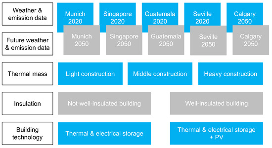 The last variant category focuses on the outlook and future behavior of the built world. Thereby, weather data for the year 2050 following the IPCC scenario RCP 8.5 are assumed to estimate the impact of the predictive control strategy [30]. In addition, the emission factor is lowered in all locations by 50%. While this assumption is rather simple and will only give a small insight into future behavior, predicting future emission factors depends on many factors, e.g., politics, society, funding for regenerative energies, and local conditions, to extend the regenerative powers. These factors are highly unpredictable. Developing a more precise prediction method for the emission factor is beyond the scope of this paper. Figure 2 illustrates an overview of the simulation variant categories that result in 240 simulation variants.