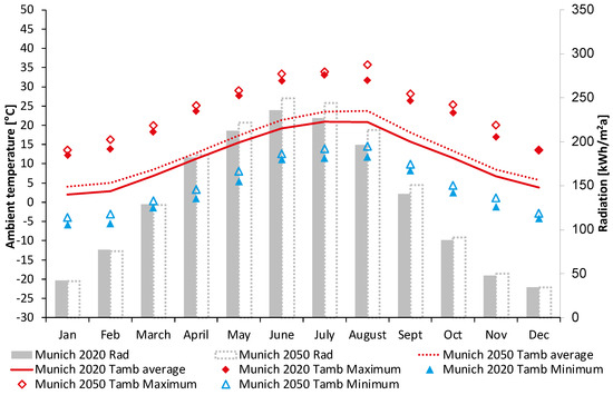 Cumulative global horizontal radiation and maximum, minimum, and average ambient temperatures per month in Munich, 2020 and 2050 (own representation—data [31]).