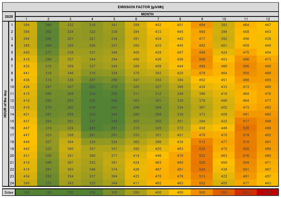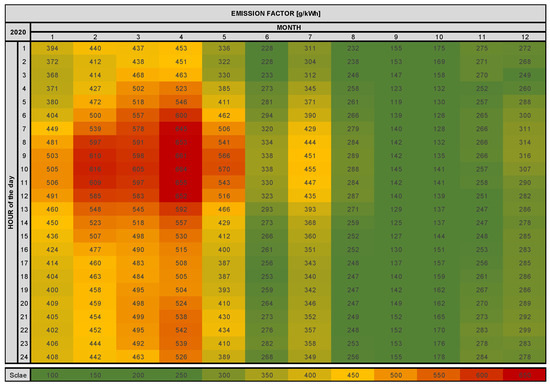 Emission data of the electricity grid in Germany, 2020, according to the hours per day and month over the year (own representation—data [32]).