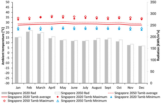 Cumulative global horizontal radiation and maximum, minimum, and average ambient temperatures per month in Singapore, 2020 and 2050 (own representation—data [31]).