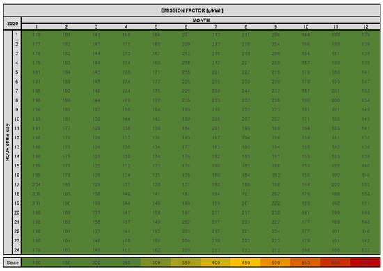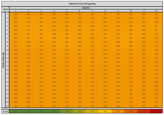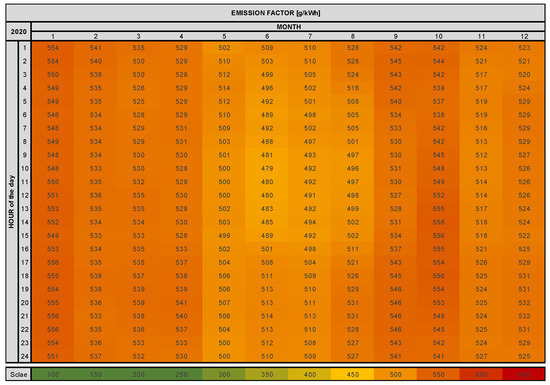 Emission data of the electricity grid in Spain, 2020, according to the hours per day and month over the year (own representation—data [32]).