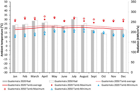 Cumulative global horizontal radiation and maximum, minimum, and average ambient temperatures per month in Guatemala City, 2020 and 2050 (own representation—data [31]).