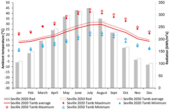 Cumulative global horizontal radiation and maximum, minimum, and average ambient temperatures per month in Seville, 2020 and 2050 (own representation—data [31]).