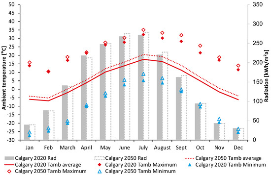 Cumulative global horizontal radiation and maximum, minimum, and average ambient temperatures per month in Calgary, 2020 and 2050 (own representation—data [31]).