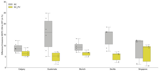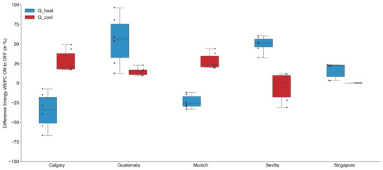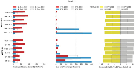Overall, the WEPC works very well in Munich’s moderate climate. The heating demand, particularly for massive constructions, is improved significantly without harming thermal comfort. The cooling demand only increases slightly in absolute numbers and confirms the fact that cooling demand was not generally necessary in Munich in 2020. The future scenarios show a small decrease in heating and a significant decrease in cooling demand, particularly for heavy constructions. But, again, the simulation variants with WEPC reduce the increase compared to those without WEPC. The emissions decrease overall with the future scenario in 2050 by up to 50%. The SC only with storage systems reduces with and without WEPC by 50%. In contrast, the emission savings for the simulation variants with PV only decrease by 45%, as the photovoltaic system still improves the emission performance and solar radiation changes slightly in 2050.