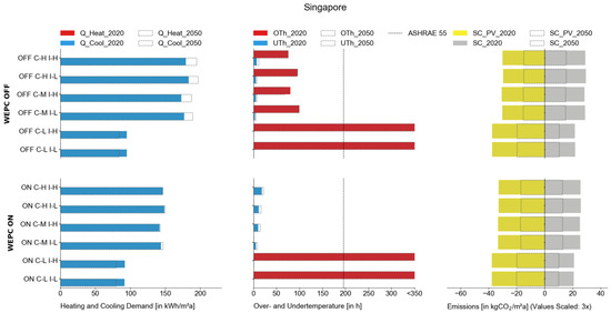 In the tropical climate of Singapore, no heating energy is needed, while cooling dominates the energy balance with 80 to 200 kWh/(m2a) for the individual simulation variants. This very high cooling demand indicates that thermal comfort can be provided for the middle and heavy construction variants. In contrast, the light simulation variants cannot stay below the threshold in all cases. In some rare moments, UThs exist that can be linked to an overcooling of the building by the powerful cooling system. Considering the scaling factor, the emissions for SC are in a range of up to +80 kgCO2/(m2a). For the simulation variants with PV, the saving reaches values up to −110 kgCO2/(m2a).