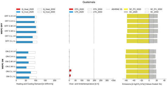 Predicting the exact weather conditions in Guatemala City in 2050 is challenging, but climate projections suggest increasing ambient temperatures. According to the Guatemalan National Institute of Seismology, Volcanology, Meteorology, and Hydrology [40], temperatures are expected to rise due to global climate change. This could lead to more frequent and intense heat waves, affecting public health, agriculture, and water resources, mainly due to the urban heat island effect and urbanization. Based on the already sufficient climate potential for regenerative energies, the future emission factor primarily depends on financial and political decisions. To promote renewable energy, Guatemala has implemented policies and incentives to encourage private investments in renewable energy projects [41]. Neighboring countries like Costa Rica have already proved that a complete regenerative energy grid is possible in that climate.