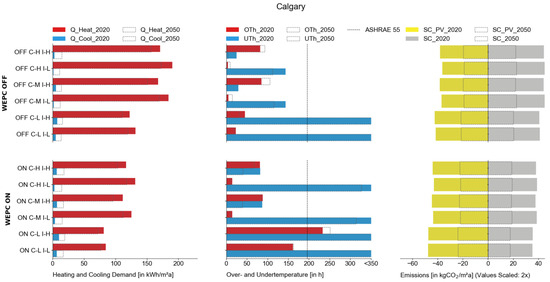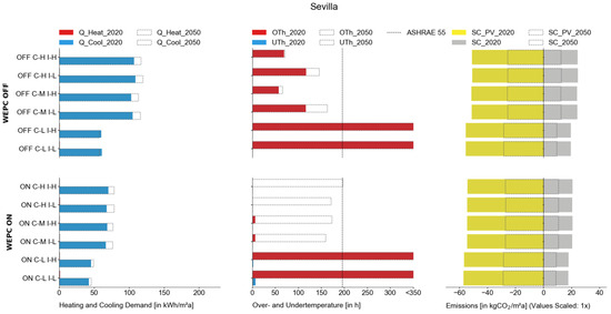 Figure 14 illustrates all WEPC variants that have cooling demands up to 40 kWh/(m2a) lower than with a standard control. In addition to that, the results show that the WEPC variants have no OThs anymore. The small increase in the UThs is a small sign of over-cooling in the morning hours when WEPC anticipates office users. For the standard control, the future cooling demand in 2050 rises with ~10 kWh/(m2a), whereby with the WEPC, the cooling demand nearly stays at the same level. Overall, simulation variants with WEPC have around 10 kgCO2/(m2a) fewer emissions with SC and the same amount of emission savings with PV. The future variants show that the emission savings for SC_PV are reduced by 50%, while the system configurations without PV show a decrease until 2050 of around 55% on average.