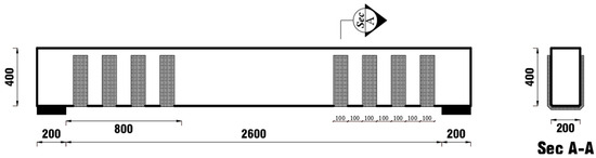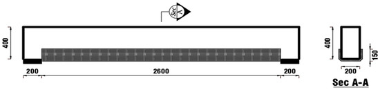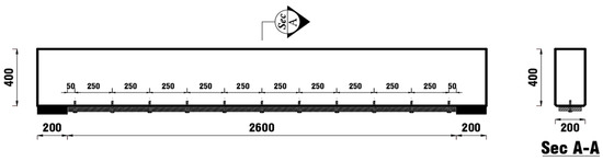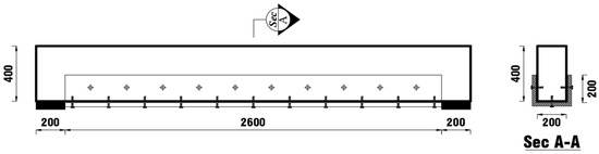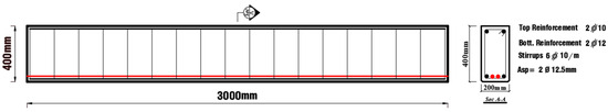 The experimental plan included testing sixteen large-scale prestressed R.C. beams in addition to four non-prestressed R.C. beams as reference. The beams were 400 mm in height, 200 mm in cross-section breadth, and 3000 mm in length. The beam specimens were divided into four models. The first model was used for flexural testing. The first model of beam specimen utilized two 12 mm diameter bars for tension reinforcement in the longitudinal steel. Additionally, two high-tensile 12.5 mm diameter prestressing wires with 50 mm eccentricity were incorporated, along with two 10 mm diameter bars as the hanger bars. Two-legged 10 mm diameter stirrups were spaced at 150 mm intervals. For shear testing of the second model, the longitudinal steel comprised two 18 mm diameter bars for tension reinforcement. The prestressing system included two high-tensile 12.5 mm diameter wires with 50 mm eccentricity. As for the hanger bars, four 22 mm diameter bars were employed, and two-legged 8 mm diameter stirrups were provided at 300 mm intervals along the beam. Detailed reinforcement configurations are visually presented in Figure 1 and Figure 2.