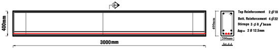 Concrete with a compressive strength of 40 MPa was used when uniaxial compressive tests on the specimens (150 mm × 150 mm × 150 mm concrete cube) were performed, and the average concrete compressive strengths at 7 and 28 days are shown in Table 2. Steel bars of different diameters (10, 12, 18, and 22 mm) were used for the main reinforcement, having 440 MPa tensile strength, and steel bars of varying diameters (8 and 10 mm) were used for the stirrups. Steel plates with a thickness of 4 mm and 345 MPa tensile strength were used as external reinforcements. Table 3 provides the detailed properties of both the steel bars and the plates. Prestressing wires with a tensile strength of 1860 MPa were used, and the detailed properties of the strands are presented in Table 4. Woven carbon fiber fabric, with a tensile strength of 4300 MPa, was applied to the beam specimens’ surface using epoxy adhesive. Detailed properties of the Woven Carbon Fiber Fabric are outlined in Table 5.