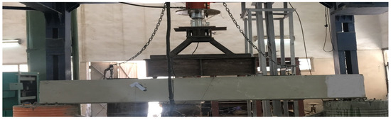 To evaluate the performance, the prestressed beams reinforced with both steel plates and woven carbon fiber fabric (WCFF) underwent testing using a two-point loading system within a 100 ton capacity loading frame. The beam was supported with one end hinged and the other end equipped with a roller. The application of the load was accomplished using a hydraulic jack, and load measurements were obtained from the load cell. Refer to Figure 11 for a visual representation of the beam test setup.