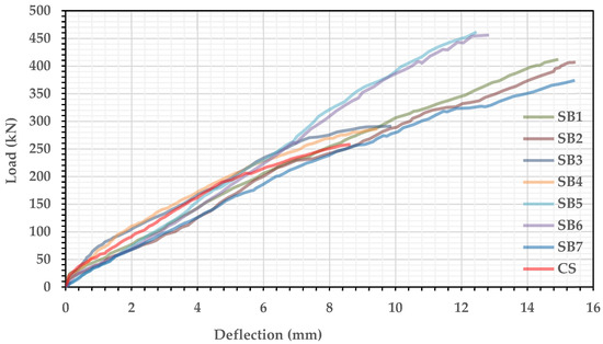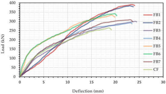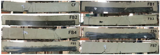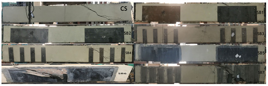 Figure 14 and Figure 15 show the tested beams’ failure modes for the flexural and shear test series. An inspection of Figure 14 suggests that all the beams experienced flexural failure, and Figure 15 suggests that all the beams experienced shear failure. For the flexural test series, the presence of the steel plates and WCFF (U-shaped) at the bottom of beams FB1 and FB2 limited the propagation of flexural cracks. The rest of the various strengthening techniques for prestressed concrete beams did not limit the propagation of flexural cracks. Beams FB3, FB4, and FB7 failed in a compressive mode by crushing concrete, while beams FB5 and FB6 failed in a tensile mode by means of a rupture in the WCFF. As for the shear test series, the presence of U-shaped steel plates for the prestressed concrete beams (SB1, SB2) led to a reduction in the propagation of shear cracks, while the different strengthening techniques for prestressed concrete beams did not limit the propagation of shear cracks. Beams SB5, FB6, and FB7 failed in shear compression failure by crushing in the concrete and rupturing in the WCFF, while beams FB3 and FB4 failed in shear compression failure by crushing in the concrete only.