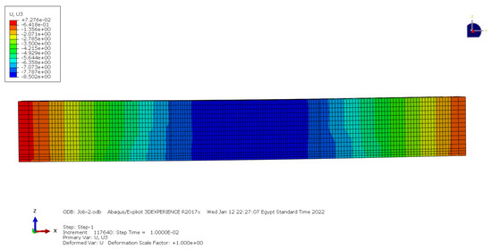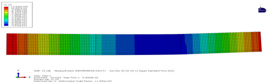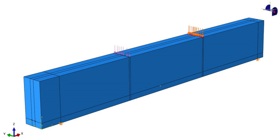 In the Abaqus model tree, boundary conditions can be added using * the load options and choosing * to create a boundary condition. A fixation was made for the two steel parts that represent roller supports in all directions, relying on the interaction between the concrete beam and the roller’s surface to reach the closest possible behavior to the experimented samples, as shown in Figure 16.