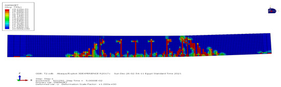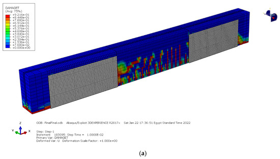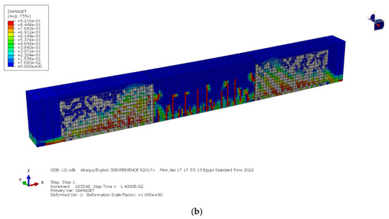 Figure 29 provides a comparison of the ultimate failure loads between the experimental and finite element modeling (FEM) results for both flexure- and shear-tested beams. The differences in the ultimate loads between the experimental and FEM results are reported for various beam configurations. For the control beam in the flexure test series (CF) and the control beam in the shear test series (CS), the differences in the ultimate loads were approximately 3% and 5%, respectively. For the beams strengthened, with respect to their flexural properties, using steel plates and WCCF wrapping (FB1, FB3, FB5, and FB7) the differences in the ultimate loads between the experimental and FEM results were around 3%, 5%, 2%, and 1%, respectively. For the beams strengthened, with respect to their shear properties, using steel plates and WCCF wrapping (SB1, SB3, SB5, and SB7) the differences in the ultimate loads between the experimental and FEM results were approximately 17%, 14%, 1%, and 6%, respectively. These differences in the ultimate loads between the experimental and FEM results provide insights into the accuracy and reliability of the finite element model in predicting the structural behavior of the tested beams under both flexure and shear conditions.