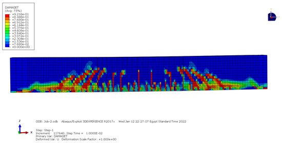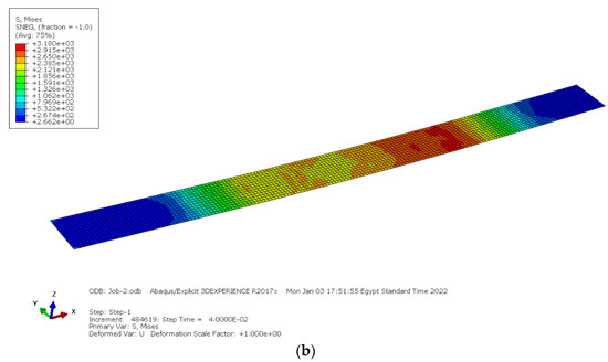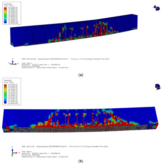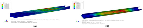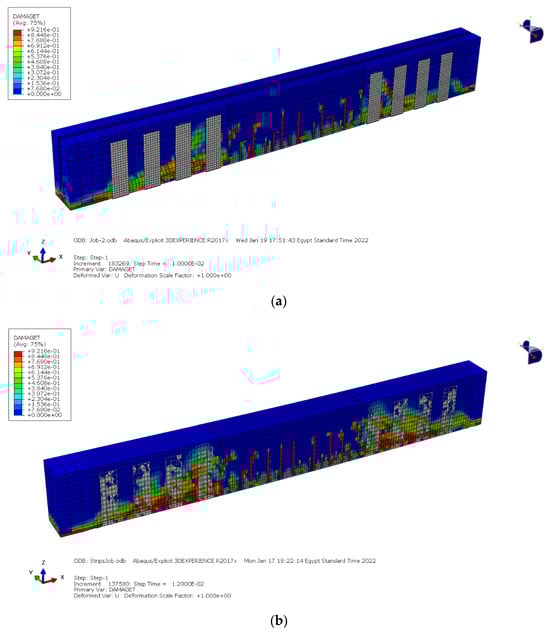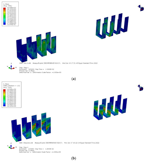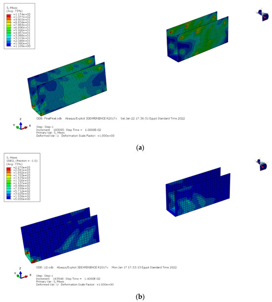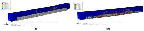 In the shear damage tests, the beams equipped with steel plates and woven carbon fiber fabric (WCFF) straps experienced ultimate loads of 281.55 kN and 397.37 kN, respectively. The initiation of the first crack occurred at loads of 126.70 kN and 143.05 kN for the steel plate and WCFF straps models, respectively. Figure 27 visually depicts the crack patterns observed in SB3 and SB7 after testing, providing insights into the failure modes and crack propagation within the beams. For a more detailed understanding of stress distribution, Figure 28 showcases the stress distribution of the steel plate and WCFF in the SB3 and SB7 models, respectively.