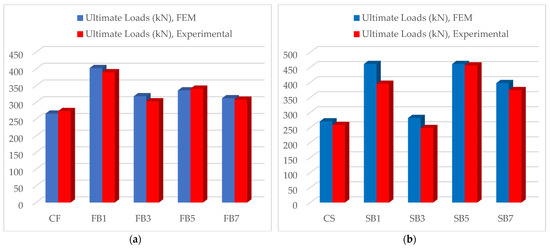 Comparison between experimental and FEM results of ultimate loads for (a) flexure-tested beams and (b) shear-tested beams.