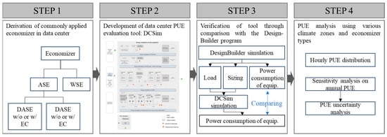 This study is structured in four steps. In the initial two steps, commonly employed systems within data centers are introduced, and a system model is proposed for dynamically calculating PUE. This model takes into account the dynamic fluctuations in cooling requirements, outdoor weather conditions, and various system parameters. The third step involves the validation of the developed program, utilizing results obtained from DesignBuilder (Version 7.0.2.4), a commercial dynamic energy analysis program. Finally, in the fourth step, an in-depth analysis of PUE based on economizer configurations in different climate regions is conducted. This step includes a sensitivity analysis to assess the impact of various system design parameters on PUE. Subsequently, the research focuses on evaluating the uncertainties in PUE related to economizer types and climate regions, with particular emphasis on the influential system parameters in this context (Figure 1).