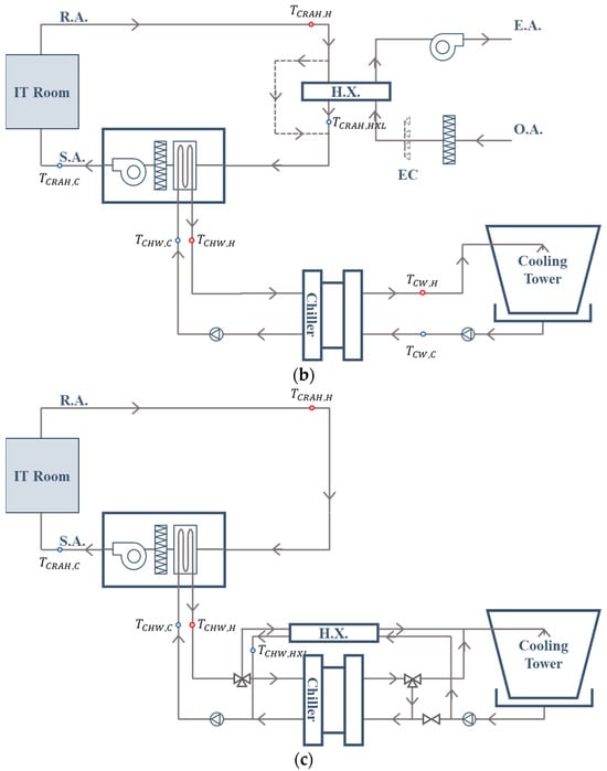 For DASE operation, the decision is determined by the outdoor dry-bulb temperature (), outdoor dew point temperature (), low-limit temperature (, generally the CRAH supply temperature), and high-limit temperature (, generally the CRAH return temperature), as shown in Figure 3a. In the free cooling mode, if is below the upper limit (15 °C) of ASHRAE’s recommended range and is lower than , the DASE system combines return air (RA) and OA to handle the cooling load without involving the chiller. In the mixed cooling mode, when is below the upper limit and falls within the range of and , DASE introduces 100% OA into the space and the chiller operates to maintain the supply air (SA) set points. In the mechanical cooling mode, if are above the upper limit or exceeds , the system recirculates air without mixing in the OA, and the chiller cools the RA to remove the cooling load.