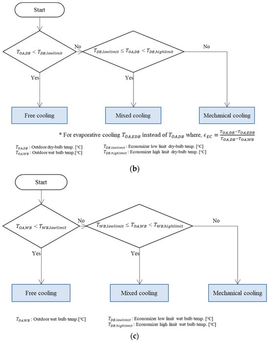 Flow charts of economizer operation conditions: (a) DASE; (b) IASE; (c) WSE.